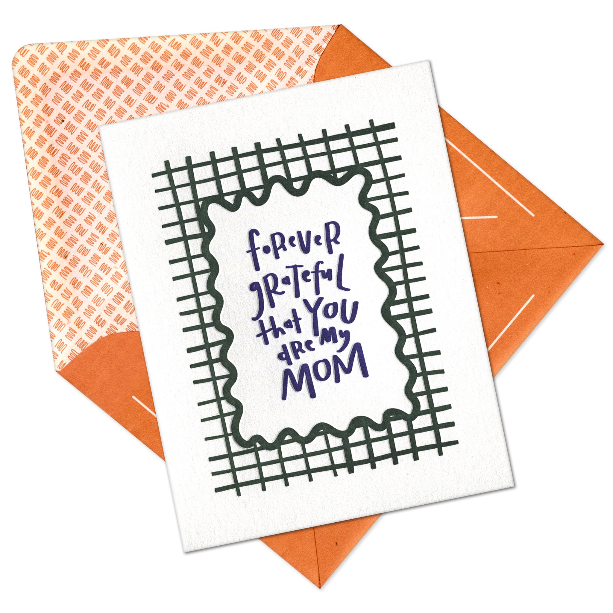 The sweetest sentiment paired with a bold grid pattern to make a mother’s day card that feels both fresh and authentic. “Forever grateful that you are mom” is hand-lettered by Allison in a playful, modern style. We especially love how fresh this color combination feels– no boring, muted pastels here! Even better, you can send this one at any time of the year when you want to make your mom feel loved and appreciated. Because we think moms should be celebrated all year long too!