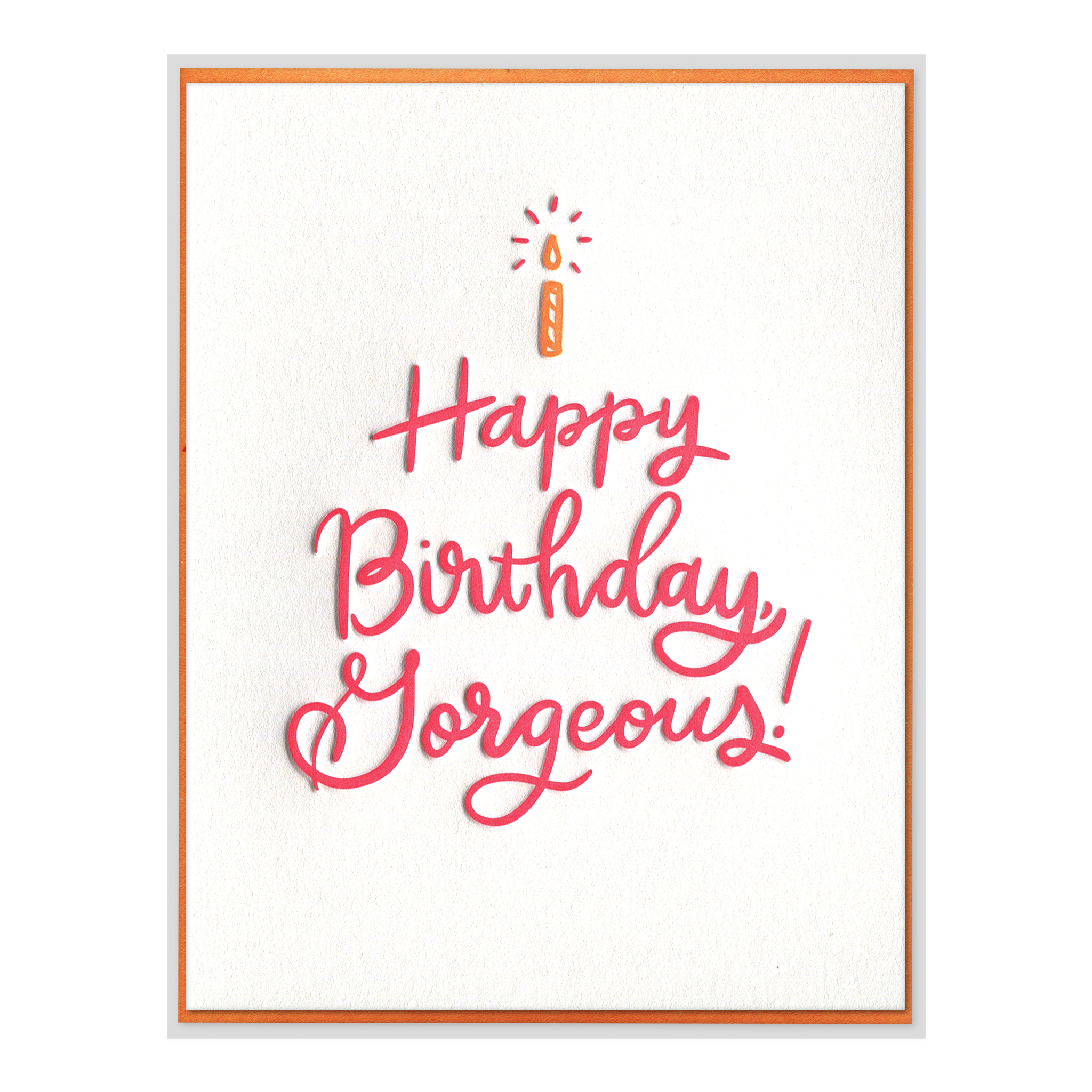 Send bright birthday wishes to that gorgeous friend! Bright coral pink script is topped with a candle, so it’s kind of like sending a little snail mail birthday cake.