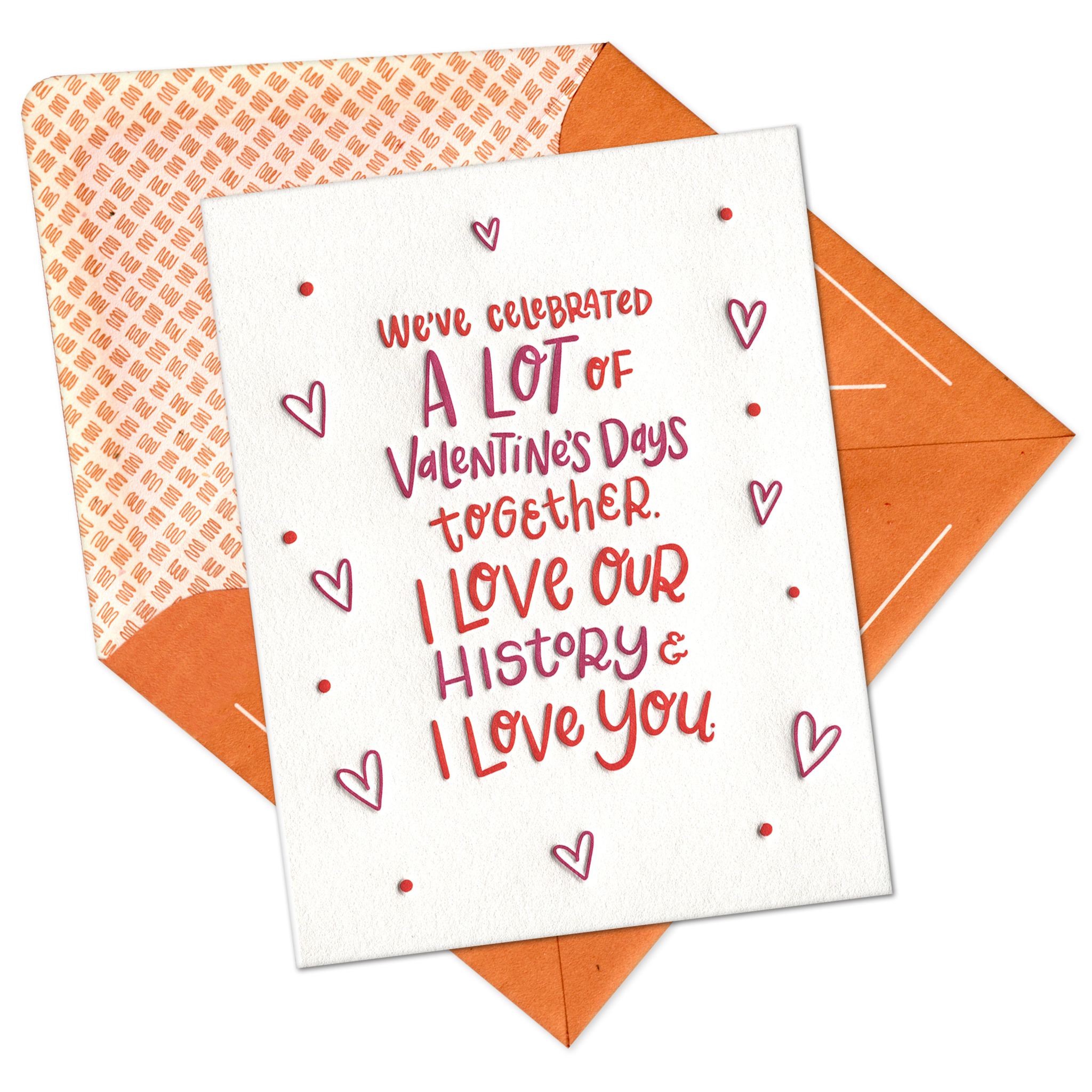 For the person who just gets you and who’s been there through the ups and downs– celebrate your history (and all of those Valentine’s Days) with this letterpress card featuring hand-drawn hearts and lettering.